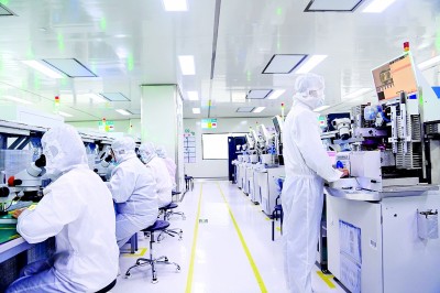 湖北武汉一家科技公司洁净车间内,员工在生产、测试光模块产品。张璨龙摄/光明图片